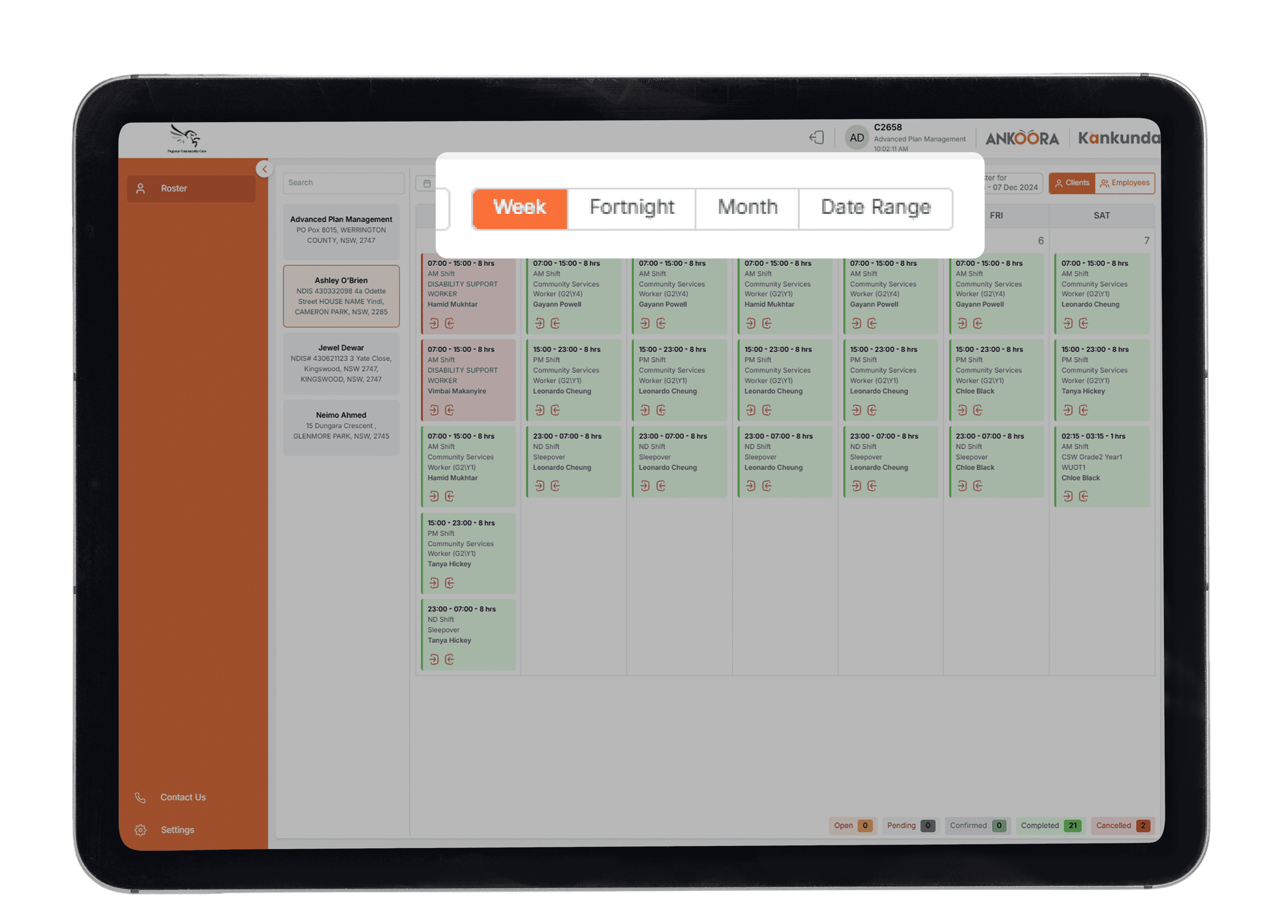 Navigate between Weekly, Fortnightly, Monthly or customised date ranges for optimal scheduling flexibility.